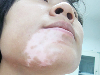 患者家属5年前发现患者面部白斑,曾在邢台当地多家医院治疗,使用外擦药,口服中药,针剂,患者自述白斑有好转,患者因服用激素药患者身体发胖,今来我院治疗。
