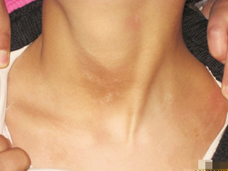 (患者初诊时,右侧锁骨处的白斑症状)
